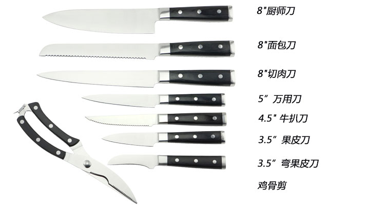 切肉刀——適用于切無骨肉類,魚類,蔬菜等。由于刃口較薄,請勿用于砍骨頭。